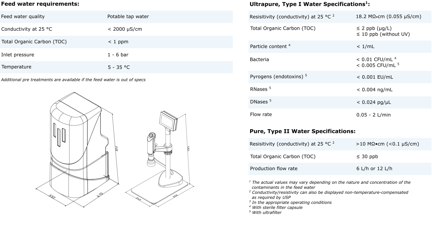 Each system meets and exceeds type 1 and type 2 water directly from tap water.